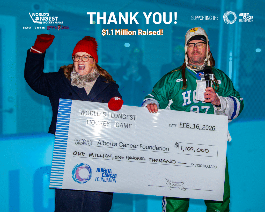 FRESH OFF THE ICE News Thanks to Your Support the World’s Longest Hockey Game Raised over $1.1 Million! February 18, 2026 - Press Release Read it Here! Media Coverage CTV: World’s Longest Hockey Game exceeds $1M fundraising goal February 17, 2026 - Press Release Read it Here! Media Coverage Edmonton Journal: World’s Longest Hockey game near Edmonton races to hit $1 million donation goal February 17, 2026 - Press Release Read it Here! Media Coverage CityNews Edmonton: World’s Longest Hockey Game near Edmonton raises over $1 million for cancer research February 17, 2026 - Press Release Read it Here! News Your Generosity has Inspired a New $100,000 Matching Gift February 13, 2026 - Press Release Read it Here! News Big News: Your World’s Longest Hockey Game Donation Impact Just Doubled February 12, 2026 - Press Release Read it Here! Media Coverage Global News: Hockey players raise funds to expand CAR T-cell therapy access in Edmonton February 11, 2026 - Press Release Read it Here! Media Coverage CochraneNow: Cochrane’s Doug French reflects on World’s Longest Hockey Game experience February 9, 2026 - Press Release Read it Here! Media Coverage Edmonton Sun: TAIT: World’s Longest Hockey Game taps into a quintessentially Canadian response February 9, 2026 - Press Release Read it Here! Media Coverage St. Albert Gazette: St. Albertan laces up his skates for World’s Longest Hockey Game February 9, 2026 - Press Release Read it Here! CATEGORIES Community Support Media Coverage News LATEST POSTS Thanks to Your Support the World’s Longest Hockey Game Raised over $1.1 Million! Thanks to Your Support the World’s Longest Hockey Game Raised over $1.1 Million! • February 18, 2026 • News CTV: World’s Longest Hockey Game exceeds $1M fundraising goal CTV: World’s Longest Hockey Game exceeds $1M fundraising goal • February 17, 2026 • Media Coverage Edmonton Journal: World’s Longest Hockey game near Edmonton races to hit $1 million donation goal Edmonton Journal: World’s Longest Hockey game near Edmonton races to hit $1 million donation goal • February 17, 2026 • Media Coverage